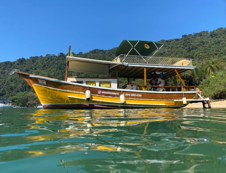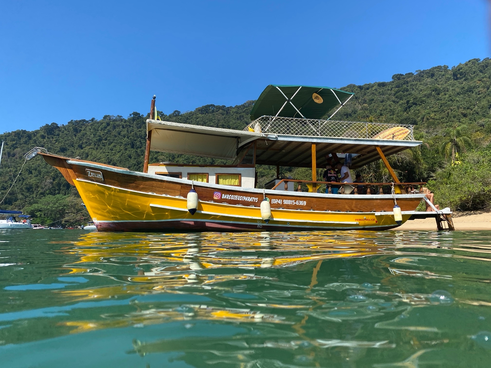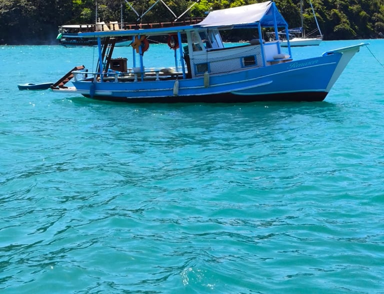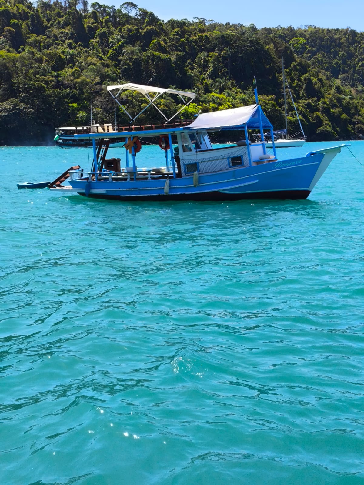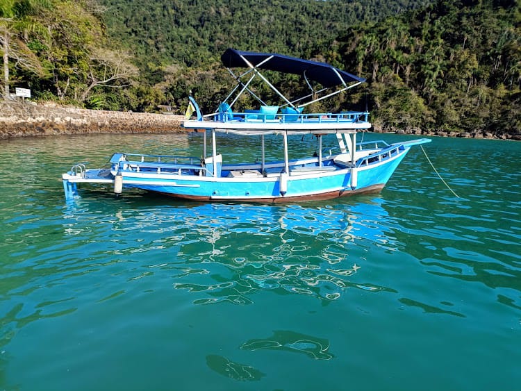 Barco destinado ao turismo marítimo. A bordo dispõe de cooler, boia espaguete, som bluetooth, máscara de mergulho, caiaque, banheiro e equipamentos de segurança.